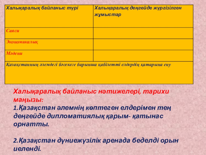 Халықаралық байланыс нәтижелері, тарихи маңызы:1.Қазақстан әлемнің көптеген елдерімен тең деңгейде дипломатиялық қарым- қатынас орнатты.2.Қазақстан дүниежүзілік аренада беделді