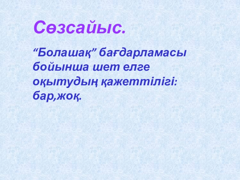 Сөзсайыс.“Болашақ” бағдарламасы бойынша шет елге оқытудың қажеттілігі: бар,жоқ.