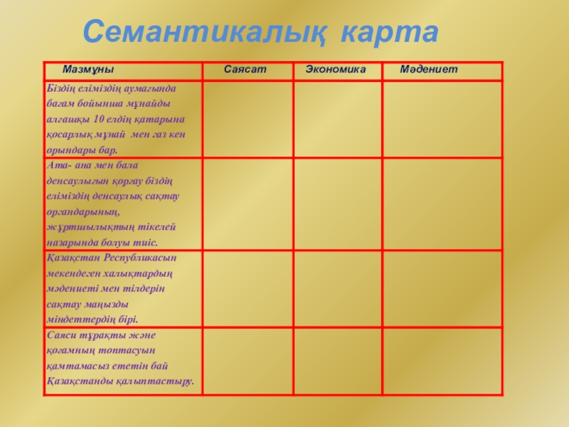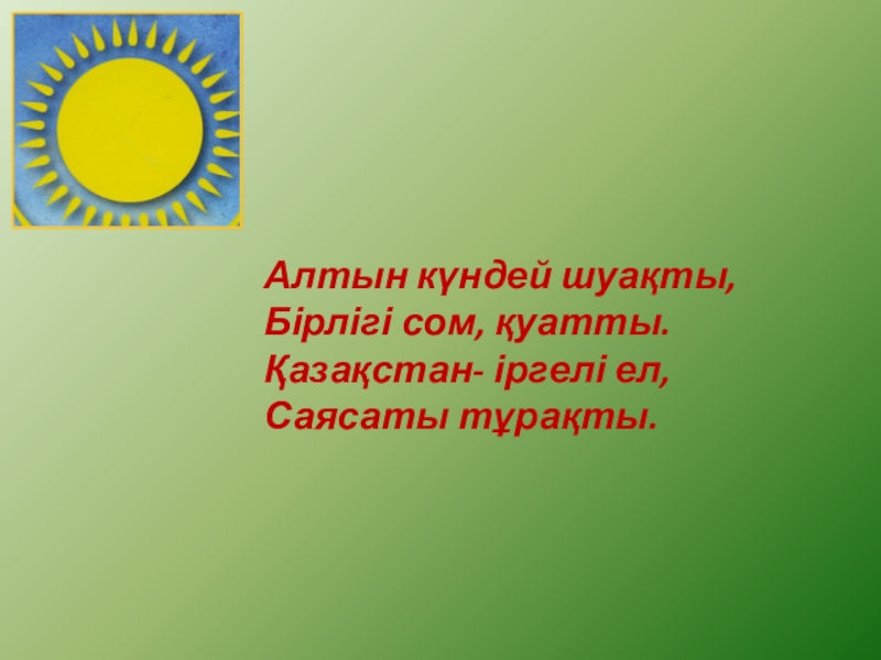Алтын күндей шуақты,Бірлігі сом, қуатты.Қазақстан- іргелі ел,Саясаты тұрақты.