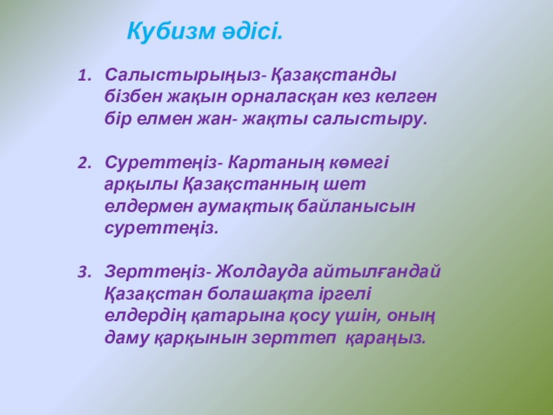 Кубизм әдісі.Салыстырыңыз- Қазақстанды бізбен жақын орналасқан кез келген бір елмен жан- жақты салыстыру.Суреттеңіз- Картаның көмегі арқылы Қазақстанның