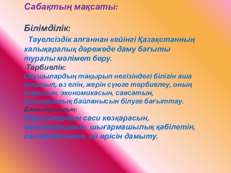 Сабақтың мақсаты:Білімділік: Тәуелсіздік алғаннан кейінгі Қазақстанның халықаралық дәрежеде даму бағыты туралы мәлімет беру. Тәрбиелік:Оқушылардың тақырып негізіндегі білігін аша отырып, өз елін, жерін сүюге тәрбиелеу, оның тарихын, экономикасын, саясатын, халықаралық байланысын білуге бағыттау. Дамытушылық:Оқушылардың саси көзқарасын, дүниетанымын,