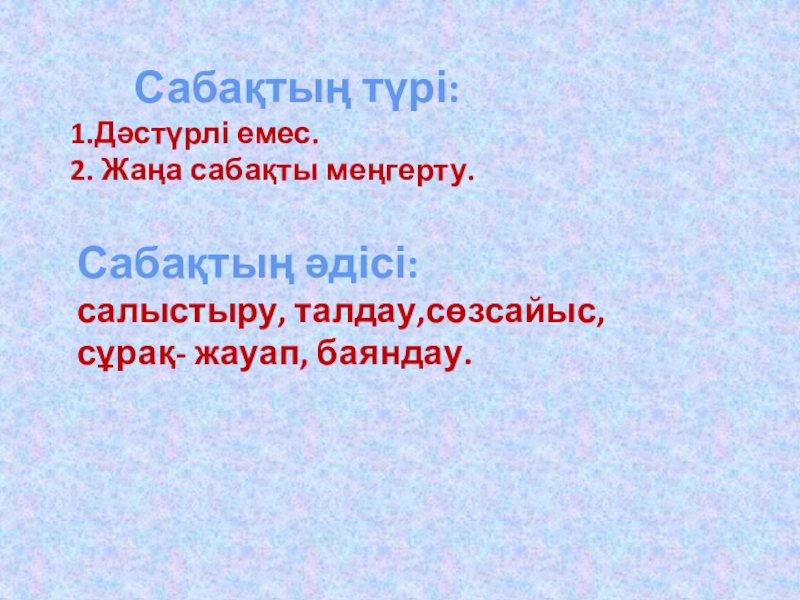 Сабақтың түрі:1.Дәстүрлі емес.2. Жаңа сабақты меңгерту.Сабақтың әдісі:салыстыру, талдау,сөзсайыс,сұрақ- жауап, баяндау.