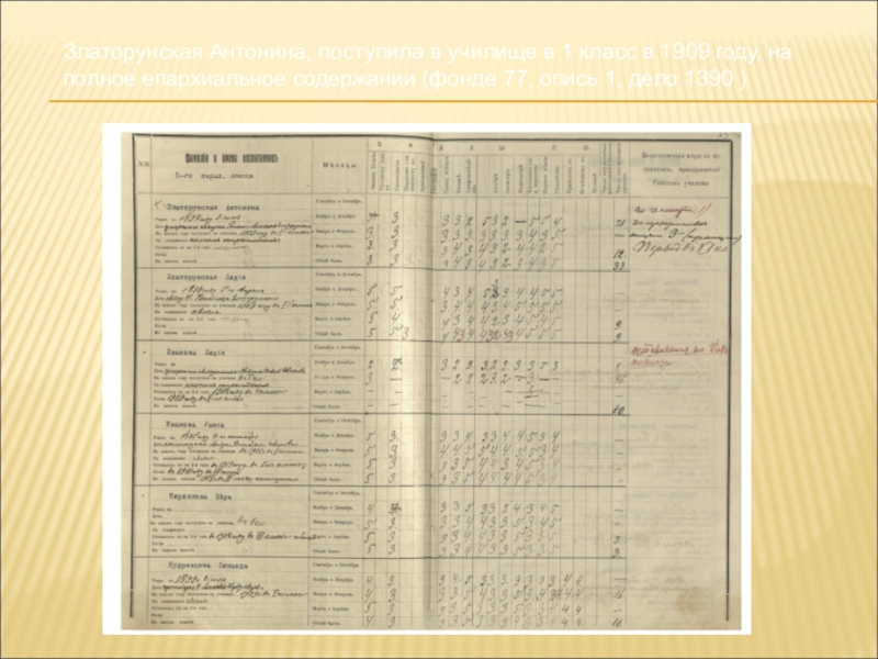 Слайд 11Златорунская Антонина, поступила в училище в 1 класс в 1909 году,