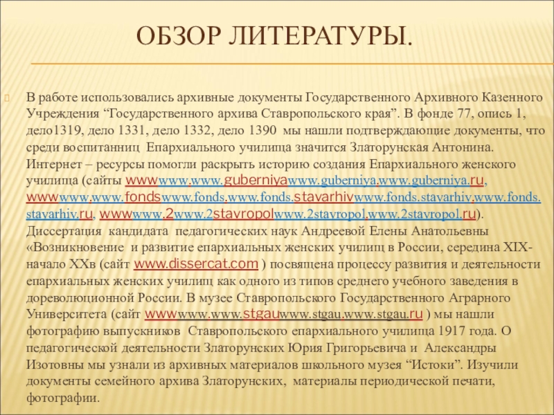 архива Ставропольского края”. В фонде 77, опись 1, дело1319, дело 1331, дело 1332, дело 1390 мы нашли подтверждающие документы, что среди воспитанниц Епархиального училища значится Златорунская Антонина. Интернет – ресурсы помогли раскрыть историю создания Епархиального женского училища (сайты wwwwww.www.guberniyawww.guberniya.www.guberniya.ru, wwwwww.www.fondswww.fonds.www.fonds.stavarhivwww.fonds.stavarhiv.www.fonds.stavarhiv.ru, wwwwww.2www.2stavropolwww.2stavropol.www.2stavropol.ru). Диссертация кандидата педагогических наук Андреевой Елены Анатольевны «Возникновение и развитие епархиальных женских училищ в России, середина XIX- начало XXв (сайт www.dissercat.com ) посвящена процессу развития и деятельности епархиальных женских училищ как одного из типов среднего учебного заведения в дореволюционной России. В музее Ставропольского Государственного Аграрного Университета (сайт wwwwww.www.stgauwww.stgau.www.stgau.ru ) мы нашли фотографию выпускников Ставропольского епархиального училища 1917 года. О педагогической деятельности Златорунских Юрия Григорьевича и Александры Изотовны мы узнали из архивных материалов школьного музея “Истоки”. Изучили документы семейного архива Златорунских, материалы периодической печати, фотографии.