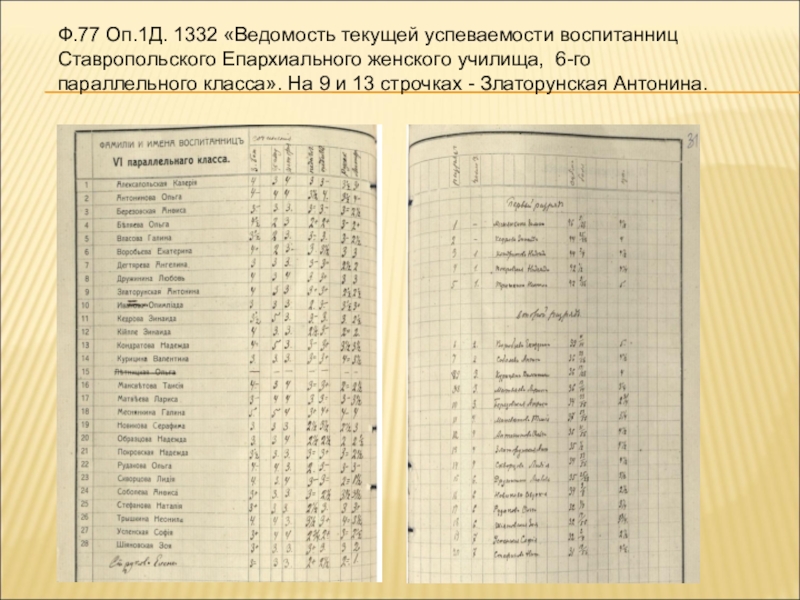 Слайд 12Ф.77 Оп.1Д. 1332 «Ведомость текущей успеваемости воспитанниц Ставропольского Епархиального женского училища,
