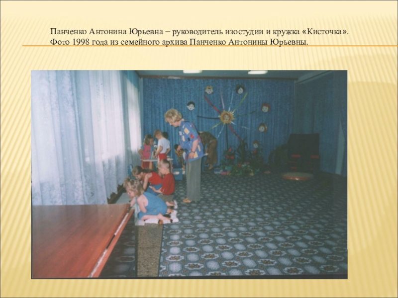 Слайд 25Панченко Антонина Юрьевна – руководитель изостудии и кружка «Кисточка». Фото 1998