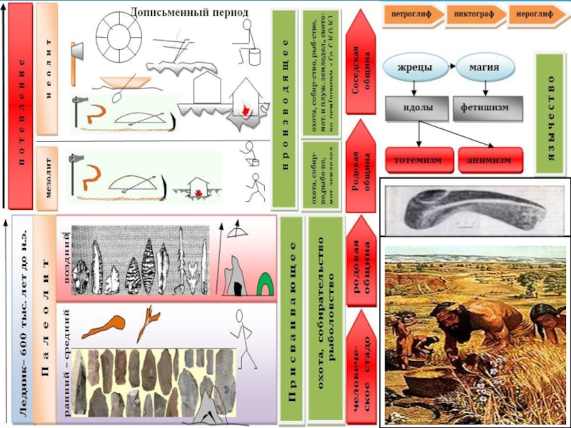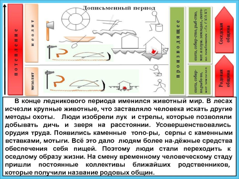 исчезли крупные животные, что заставляло человека искать другие методы охоты. Люди изобрели лук и стрелы, которые позволяли добывать дичь и зверя на расстоянии. Усовершенствовались орудия труда. Появились каменные топо-ры, серпы с каменными вставками, мотыги. Всё это дало людям более на-дёжные средства обеспечения себя пищей. Поэтому люди стали переходить к оседлому образу жизни. На смену временному человеческому стаду пришли постоянные коллективы ближайших родственников, которые получили название родовых общин.