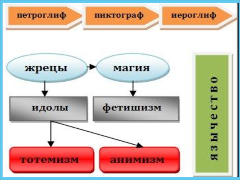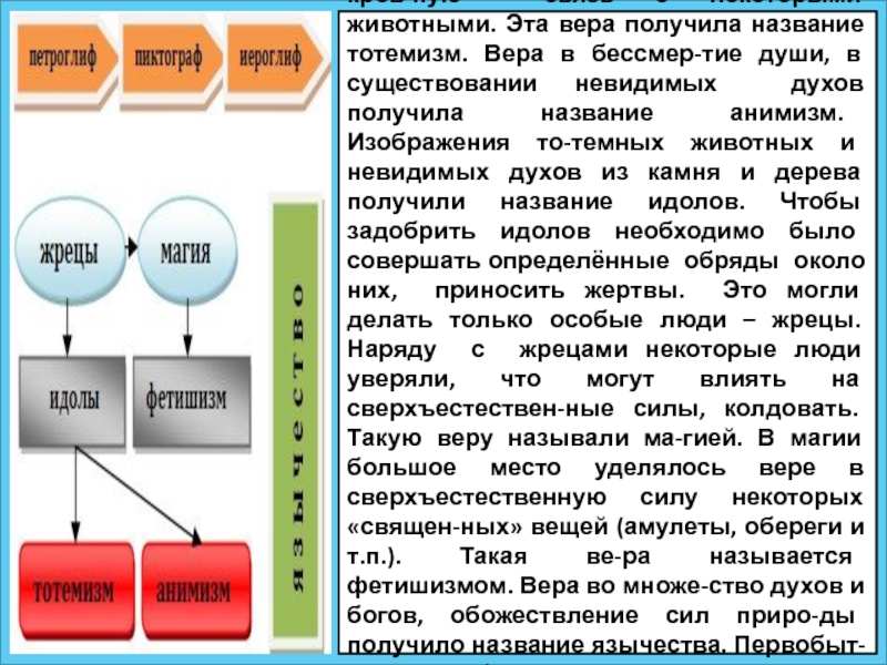 вера получила название тотемизм. Вера в бессмер-тие души, в существовании невидимых духов получила название анимизм. Изображения то-темных животных и невидимых духов из камня и дерева получили название идолов. Чтобы задобрить идолов необходимо было совершать определённые обряды около них, приносить жертвы. Это могли делать только особые люди – жрецы. Наряду с жрецами некоторые люди уверяли, что могут влиять на сверхъестествен-ные силы, колдовать. Такую веру называли ма-гией. В магии большое место уделялось вере в сверхъестественную силу некоторых «священ-ных» вещей (амулеты, обереги и т.п.). Такая ве-ра называется фетишизмом. Вера во множе-ство духов и богов, обожествление сил приро-ды получило название язычества. Первобыт-ные люди были язычниками.
