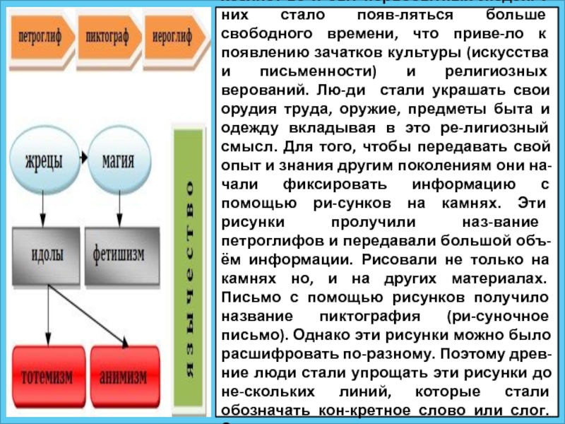 стало появ-ляться больше свободного времени, что приве-ло к появлению зачатков культуры (искусства и письменности) и религиозных верований. Лю-ди стали украшать свои орудия труда, оружие, предметы быта и одежду вкладывая в это ре-лигиозный смысл. Для того, чтобы передавать свой опыт и знания другим поколениям они на-чали фиксировать информацию с помощью ри-сунков на камнях. Эти рисунки пролучили наз-вание петроглифов и передавали большой объ-ём информации. Рисовали не только на камнях но, и на других материалах. Письмо с помощью рисунков получило название пиктография (ри-суночное письмо). Однако эти рисунки можно было расшифровать по-разному. Поэтому древ-ние люди стали упрощать эти рисунки до не-скольких линий, которые стали обозначать кон-кретное слово или слог. Эти условные рисунки стали называть иероглифы.