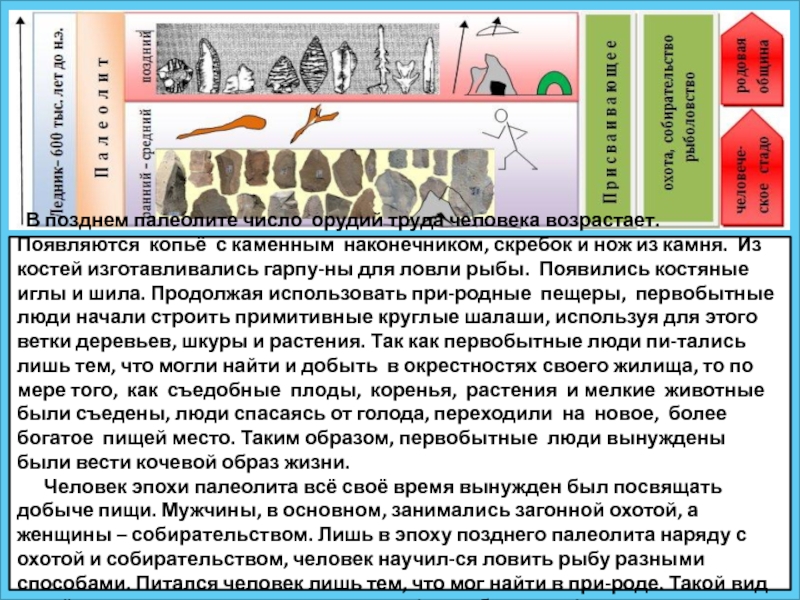 копьё с каменным наконечником, скребок и нож из камня. Из костей изготавливались гарпу-ны для ловли рыбы. Появились костяные иглы и шила. Продолжая использовать при-родные пещеры, первобытные люди начали строить примитивные круглые шалаши, используя для этого ветки деревьев, шкуры и растения. Так как первобытные люди пи-тались лишь тем, что могли найти и добыть в окрестностях своего жилища, то по мере того, как съедобные плоды, коренья, растения и мелкие животные были съедены, люди спасаясь от голода, переходили на новое, более богатое пищей место. Таким образом, первобытные люди вынуждены были вести кочевой образ жизни.