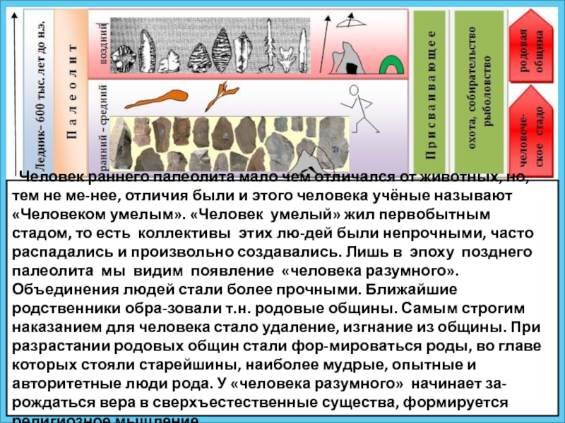 не ме-нее, отличия были и этого человека учёные называют «Человеком умелым». «Человек умелый» жил первобытным стадом, то есть коллективы этих лю-дей были непрочными, часто распадались и произвольно создавались. Лишь в эпоху позднего палеолита мы видим появление «человека разумного». Объединения людей стали более прочными. Ближайшие родственники обра-зовали т.н. родовые общины. Самым строгим наказанием для человека стало удаление, изгнание из общины. При разрастании родовых общин стали фор-мироваться роды, во главе которых стояли старейшины, наиболее мудрые, опытные и авторитетные люди рода. У «человека разумного» начинает за-рождаться вера в сверхъестественные существа, формируется религиозное мышление.
