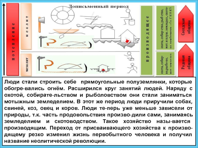 занятий людей. Наряду с охотой, собирате-льством и рыболовством они стали заниматься мотыжным земледелием. В этот же период люди приручили собак, свиней, коз, овец и коров. Люди те-перь уже меньше зависели от природы, т.к. часть продовольствия произво-дили сами, занимаясь земледелием и скотоводством. Такое хозяйство назы-вается производящим. Переход от присваивающего хозяйства к произво-дящему резко изменил жизнь первобытного человека и получил название неолитической революции.