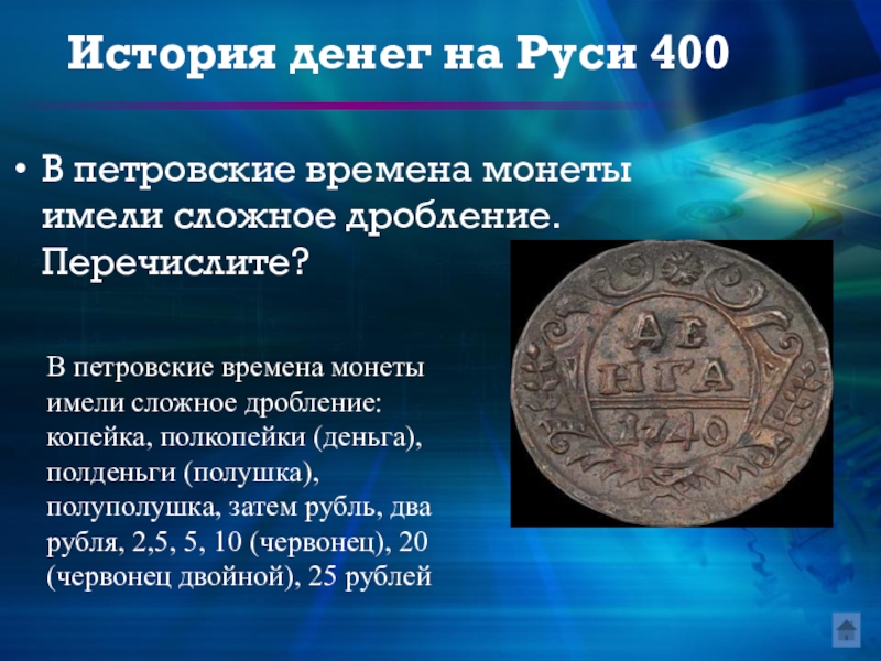 В петровские времена монеты имели сложное дробление: копейка, полкопейки (деньга), полденьги (полушка), полуполушка, затем рубль, два рубля, 2,5, 5, 10 (червонец), 20 (червонец двойной), 25 рублей