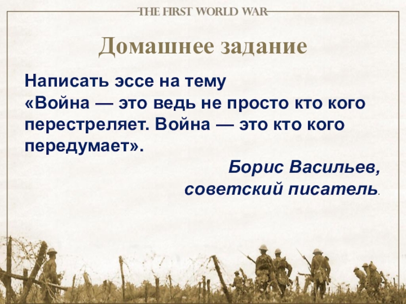Домашнее заданиеНаписать эссе на тему «Война — это ведь не просто кто кого перестреляет. Война — это