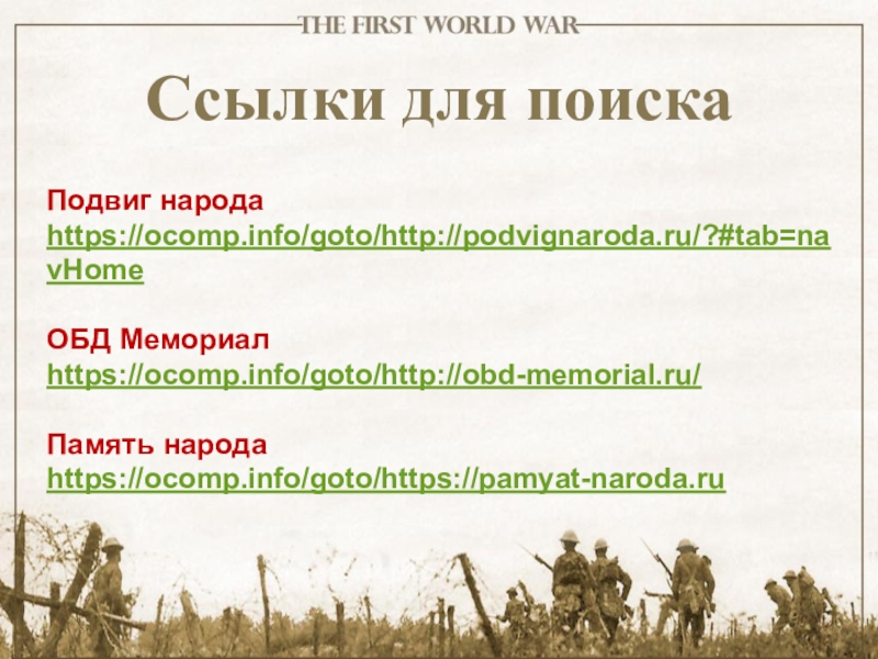 Ссылки для поиска Подвиг народа https://ocomp.info/goto/http://podvignaroda.ru/?#tab=navHome  ОБД Мемориалhttps://ocomp.info/goto/http://obd-memorial.ru/  Память народаhttps://ocomp.info/goto/https://pamyat-naroda.ru