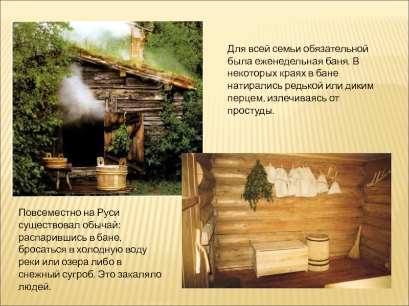 Повсеместно на Руси существовал обычай: распарившись в бане, бросаться в холодную воду реки или озера либо в снежный сугроб. Это закаляло людей.