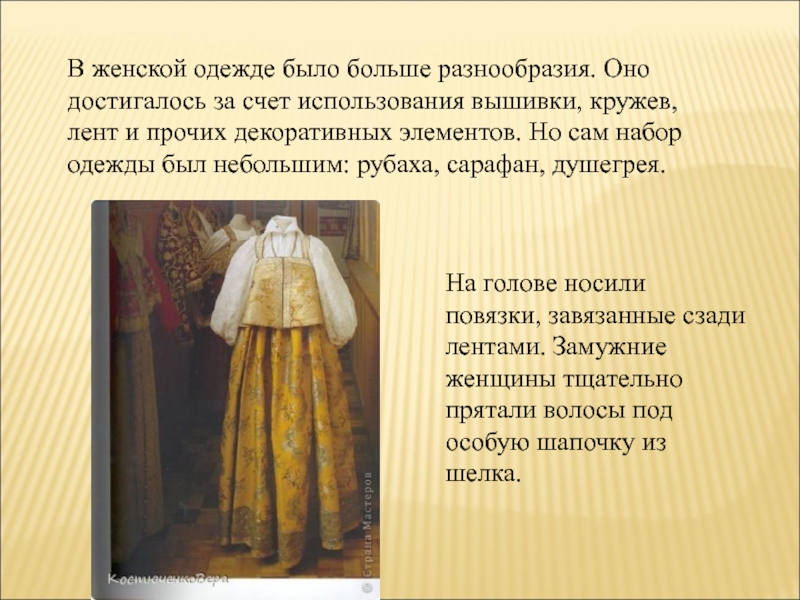 На голове носили повязки, завязанные сзади лентами. Замужние женщины тщательно прятали волосы под особую шапочку из шелка.
