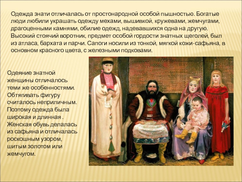 Женская обувь делалась из сафьяна и отличалась роскошным узором, шитым золотом или жемчугом.