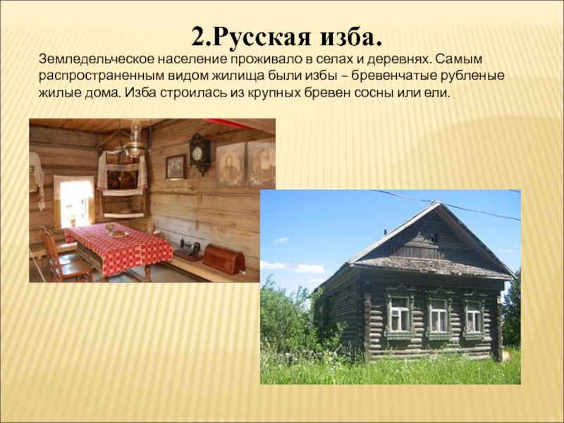 Ограниченность пространства избы заставляла крестьян иметь лишь самые необходимые вещи. К стенам крепились широкие доски-лавки или ставились скамьи на ножках. К ним придвигался стол