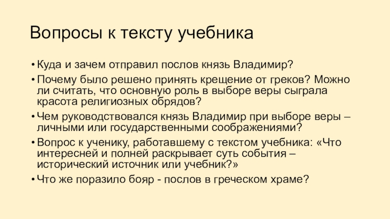Вопросы к тексту учебникаКуда и зачем отправил послов князь Владимир?Почему было решено принять крещение от греков? Можно