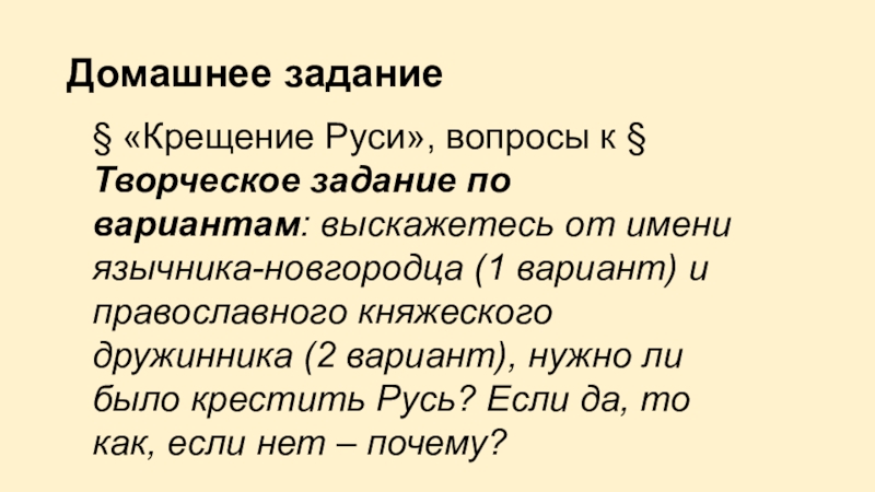 Домашнее задание§ «Крещение Руси», вопросы к §Творческое задание по вариантам: выскажетесь от имени язычника-новгородца (1 вариант) и