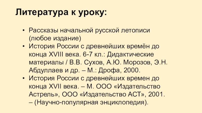 Литература к уроку: Рассказы начальной русской летописи (любое издание)История России с древнейших времён до конца XVIII века.