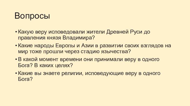 ВопросыКакую веру исповедовали жители Древней Руси до правления князя Владимира? Какие народы Европы и Азии в развитии