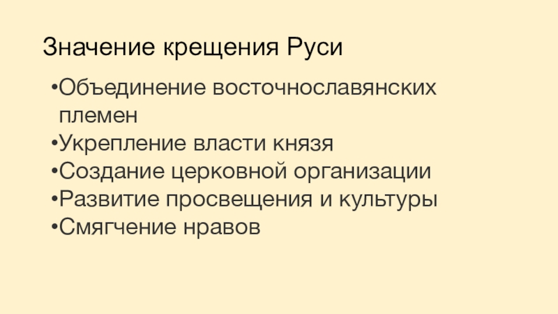 Значение крещения РусиОбъединение восточнославянских племенУкрепление власти князяСоздание церковной организацииРазвитие просвещения и культурыСмягчение нравов