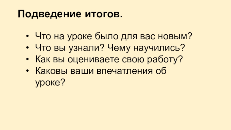 Подведение итогов. Что на уроке было для вас новым?Что вы узнали? Чему научились?Как вы оцениваете свою работу?Каковы