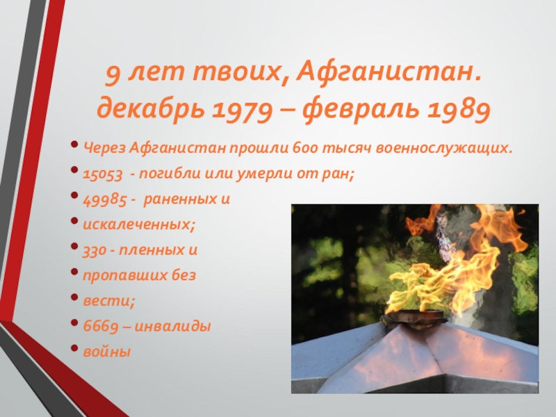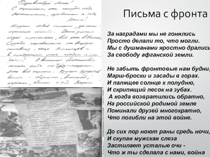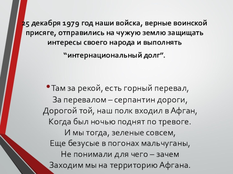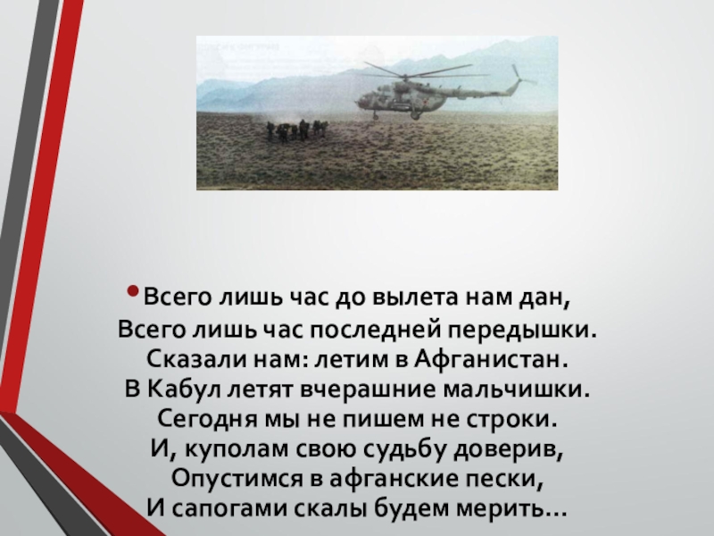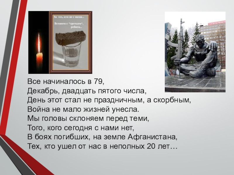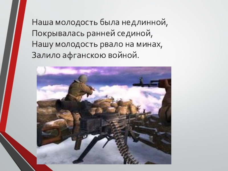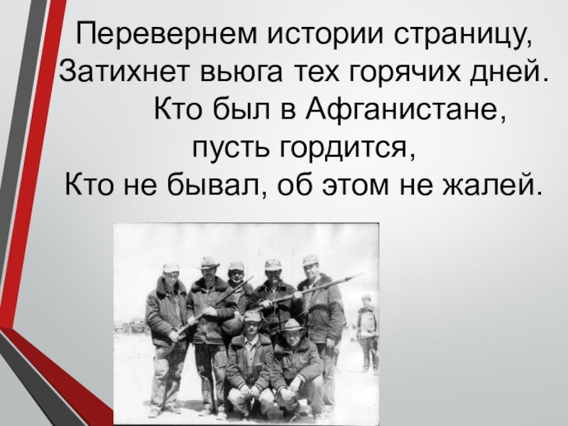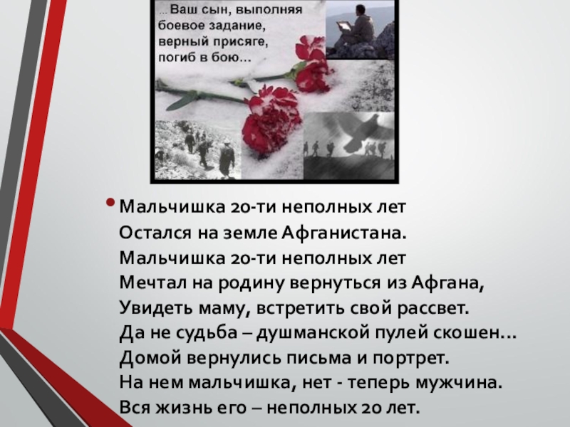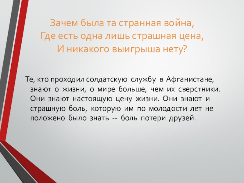 Те, кто проходил солдатскую службу в Афганистане, знают о жизни, о мире больше, чем их сверстники. Они знают настоящую цену жизни. Они знают и страшную боль, которую им по молодости лет не положено было знать -- боль потери друзей.