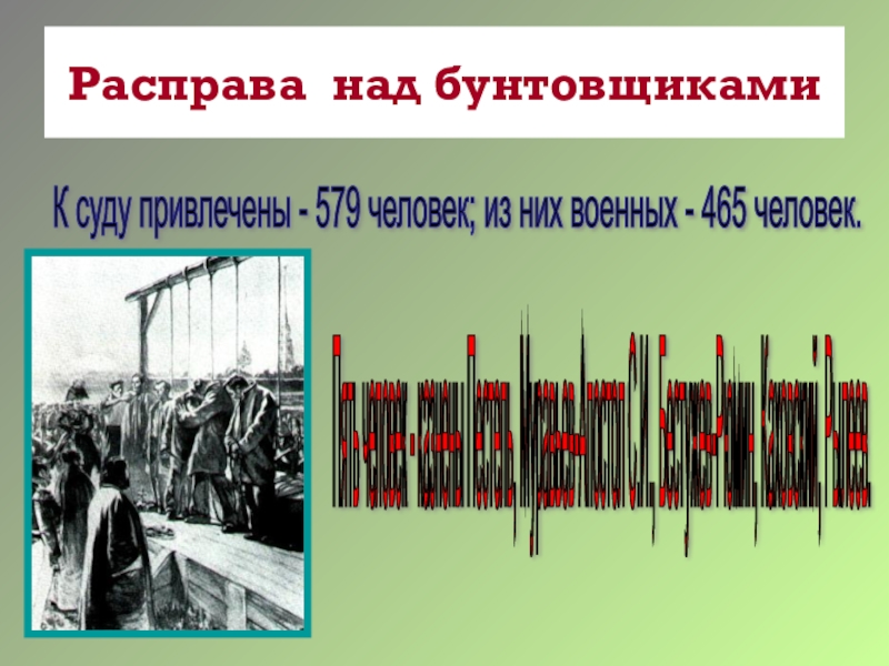 Пять человек - казнены Пестель, Муравьев-Апостол С.И., Бестужев-Рюмин, Каховский, Рылеев.