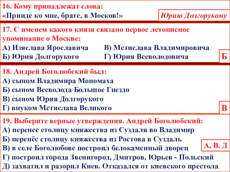 19. Выберите верные утверждения. Андрей Боголюбский: