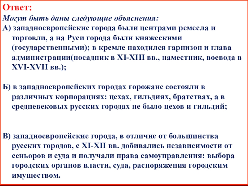 А) западноевропейские города были центрами ремесла и торговли, а на Руси города были княжескими(государственными); в кремле находился гарнизон и глава администрации(посадник в XI-XIII вв., наместник, воевода в XVI-XVII вв.);