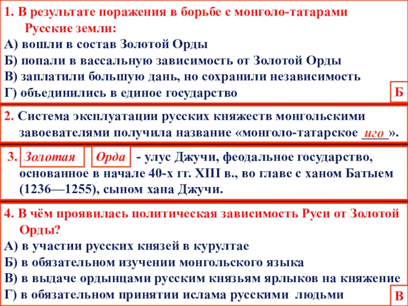 В) русские князья не смогли договориться о совместных действиях против нашествия Батыя, что привело к установлению монголо-татарского(ордынского) ига более чем на 200 лет.