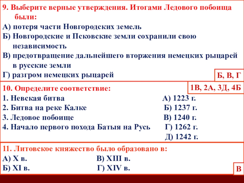 9. Выберите верные утверждения. Итогами Ледового побоища были: