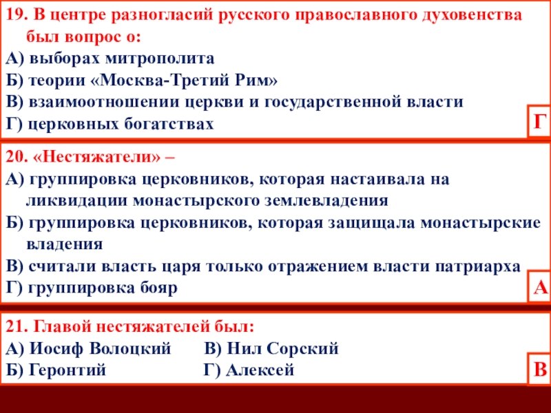 А) Иосиф Волоцкий В) Нил Сорский