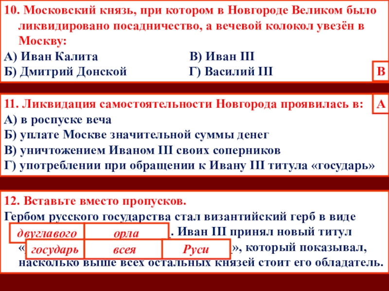 10. Московский князь, при котором в Новгороде Великом было ликвидировано посадничество, а вечевой колокол увезён в Москву: