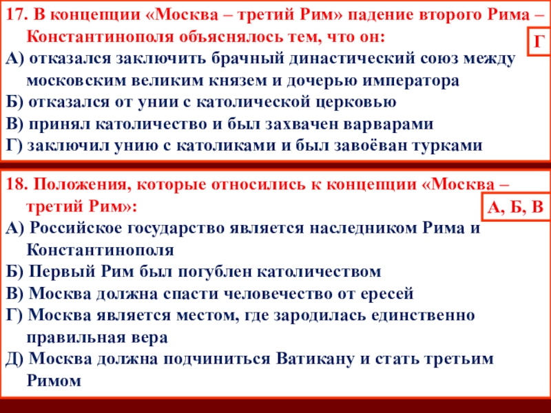 16. Появление и разработка теории «Москва – Третий Рим» относится к:
