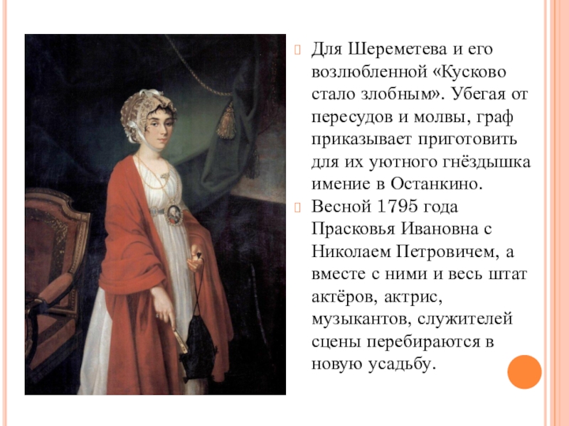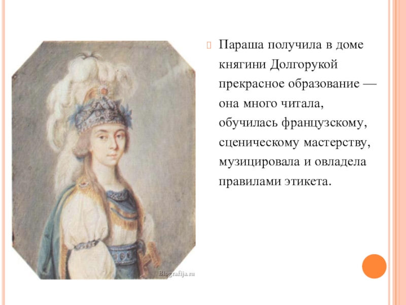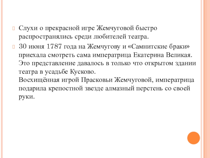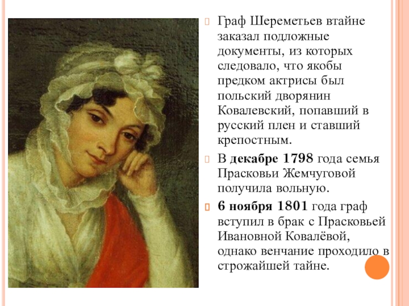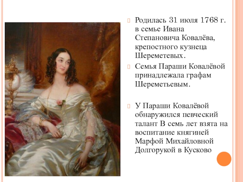 Согласно традиции, по которой актёрам шереметевского театра давали имена по названиям драгоценных камней, Прасковья Ковалёва получила псевдоним Жемчугова.