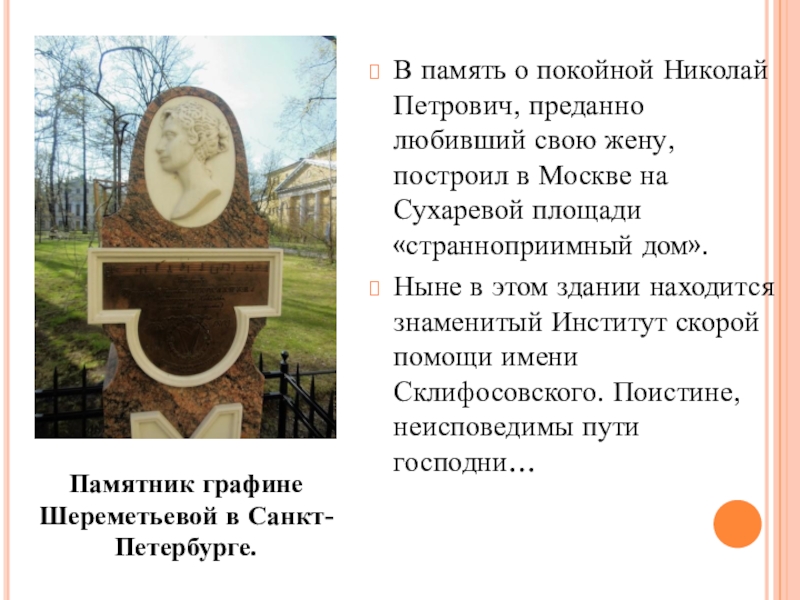 Памятник графине Шереметьевой в Санкт-Петербурге.