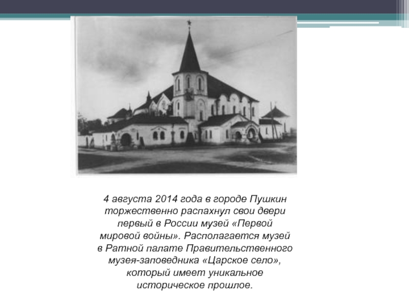 двери первый в России музей «Первой мировой войны». Располагается музей в Ратной палате Правительственного музея-заповедника «Царское село», который имеет уникальное историческое прошлое.
