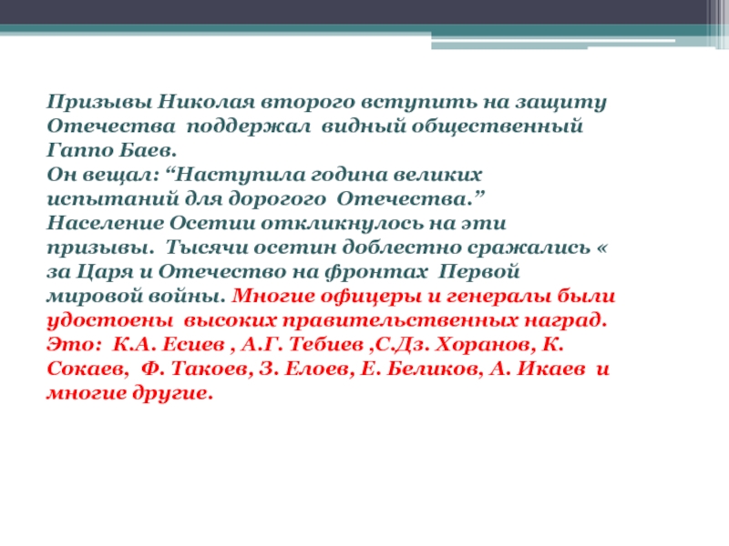 Население Осетии откликнулось на эти призывы. Тысячи осетин доблестно сражались « за Царя и Отечество на фронтах Первой мировой войны. Многие офицеры и генералы были удостоены высоких правительственных наград.