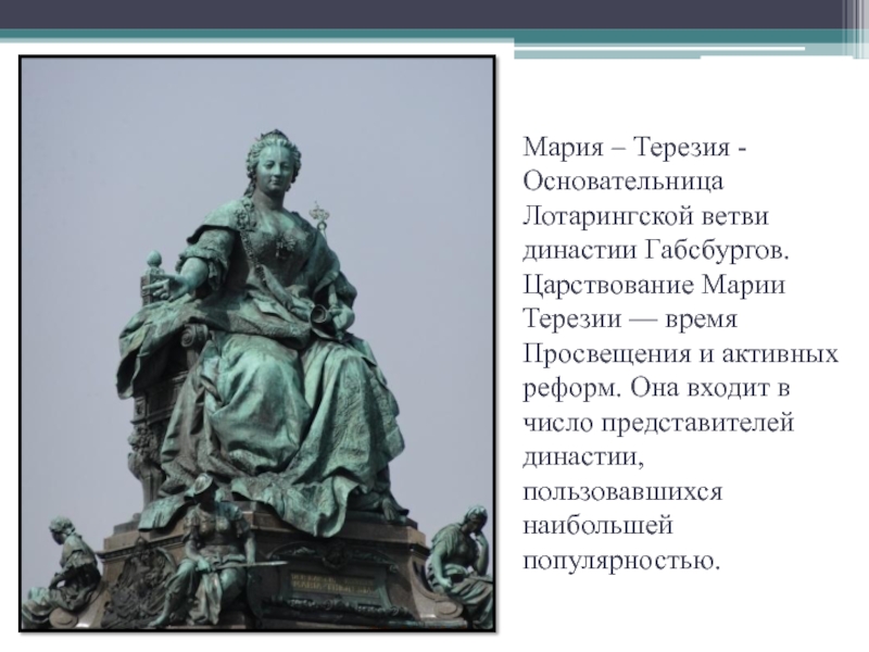 Слайд 5Мария – Терезия - Основательница Лотарингской ветви династии Габсбургов. Царствование Марии