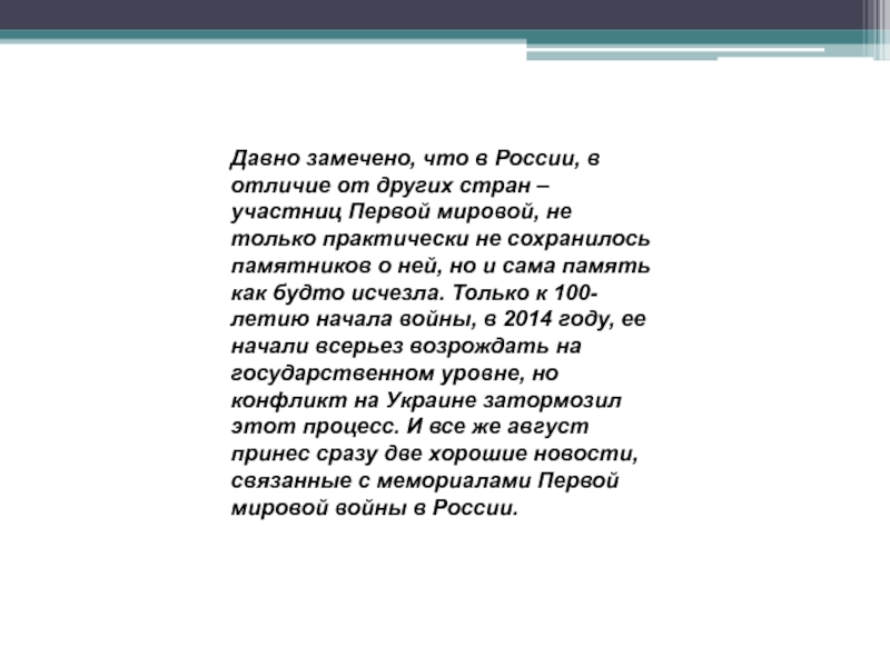 участниц Первой мировой, не только практически не сохранилось памятников о ней, но и сама память как будто исчезла. Только к 100-летию начала войны, в 2014 году, ее начали всерьез возрождать на государственном уровне, но конфликт на Украине затормозил этот процесс. И все же август принес сразу две хорошие новости, связанные с мемориалами Первой мировой войны в России.