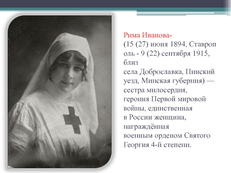 Слайд 68Рима Иванова- (15 (27) июня 1894, Ставрополь - 9 (22) сентября 1915, близ села Доброславка, Пинский уезд, Минская губерния) — сестра милосердия, героиня Первой мировой