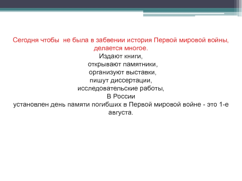 Слайд 65Сегодня чтобы не была в забвении история Первой мировой войны, делается