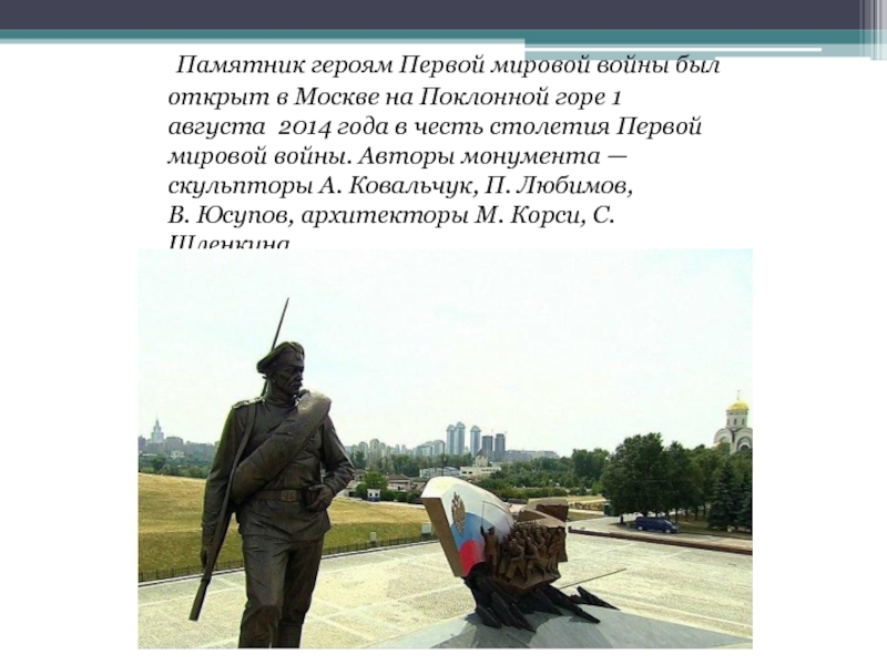 Слайд 64 Памятник героям Первой мировой войны был открыт в Москве на Поклонной горе 1 августа 2014