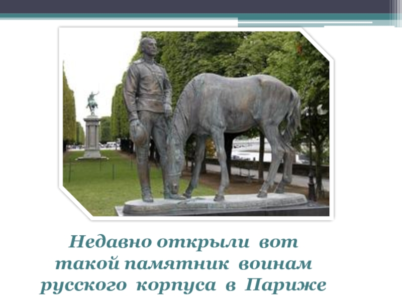 Слайд 61Недавно открыли вот такой памятник воинам русского корпуса в Париже