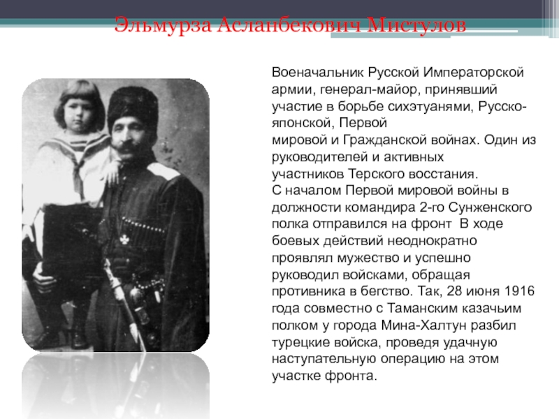 Слайд 55Военачальник Русской Императорской армии, генерал-майор, принявший участие в борьбе сихэтуанями, Русско-японской, Первой мировой и Гражданской войнах. Один из