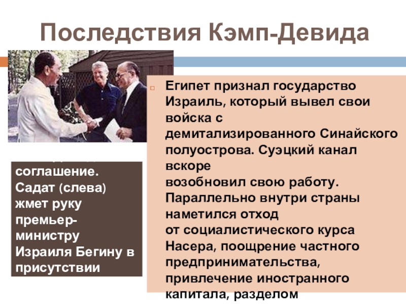 Кэмп-Дэвидское соглашение. Садат (слева) жмет руку премьер-министру Израиля Бегину в присутствии Картера
